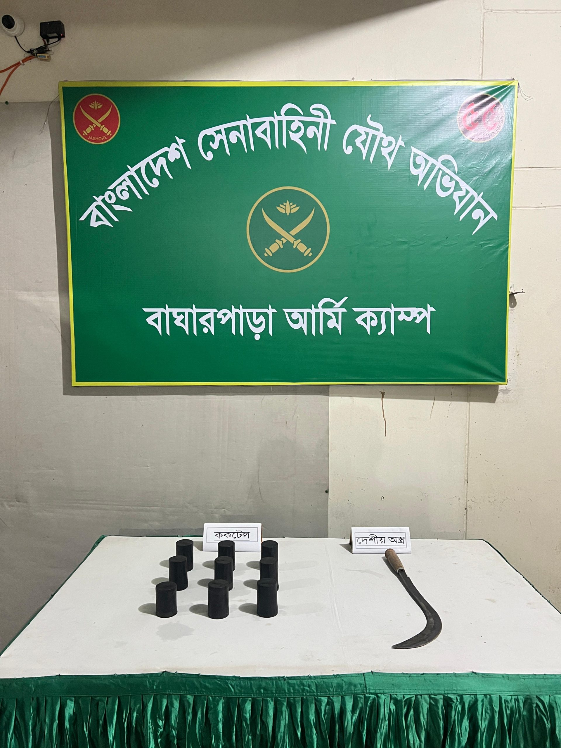 অভিযানকালে যশোর জেলার বাঘারপাড়া উপজেলার জামদিয়া ইউনিয়নের জয়রামপুর গ্রামের খান বাড়ি রাস্তার পাশে একটি পরিত্যক্ত স্থান থেকে ৯টি ককটেল ও একটি দেশীয় রামদা উদ্ধার করা হয়।