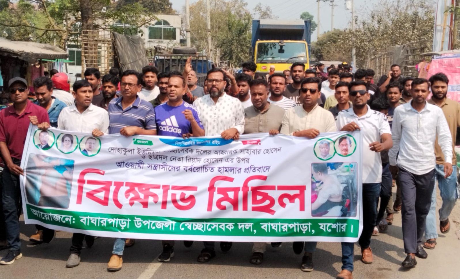 নিজস্ব প্রতিনিধি, বাঘারপাড়া (যশোর):যশোরের বাঘারপাড়া উপজেলার দোহাকুলা ইউনিয়ন স্বেচ্ছাসেবক দলের আহ্বায়ক সাহাবার হোসেন ও ছাত্রদল নেতা রিয়াদের ওপর হামলার প্রতিবাদে বিক্ষোভ মিছিল ও প্রতিবাদ সমাবেশ অনুষ্ঠিত হয়েছে।