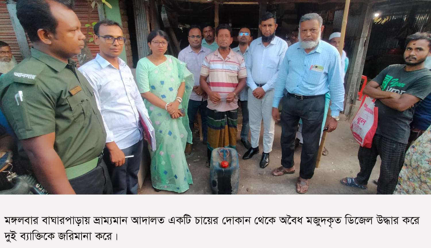 বাঘারপাড়া উপজেলা নির্বাহী অফিসার ভুপালী সরকার জানিয়েছেন, তিনি গোপন সংবাদের মাধ্যমে জানতে পারেন বাঘারপাড়া চৌরাস্তা বাজারের স্বর্ণপটিতে আজিজুর রহমানের চায়ের দোকানে অবৈধভাবে ডিজেল সংরক্ষণ করে উচ্চ দামে বিক্রি করছে। বিকাল চারটা পাঁচ মিনিটে তিনি ঐ দোকানে হানা দেন। এ সময় চায়ের দোকান থেকে ১০ লিটার ডিজেল উদ্ধার হয়। বিষয়টি নির্বাহী অফিসার তাৎক্ষনিকভাবে বাঘারপাড়া উপজেলা কৃষি কর্মকর্তা সাইয়েদা নাসরিন জাহানকে অবহিত করেন। একই সাথে তিনি প্রকৃত কৃষক সনাক্তের জন্য পৌর ব্লকের দায়িত্বরত উপসহকারি কৃষি কর্মকর্তা সাদ্দাম হোসেনকে পাঠাতে বলেন। ভ্রাম্যমান আদালত দীর্ঘ দেড় ঘন্টা অপেক্ষার পরও দেখা মেলেনি উপসহকারি কৃষি কর্মকর্তা সাদ্দাম হোসেনের। নিরুপায় হয়ে উপজেলা কৃষি কর্মকর্তা ঘটনাস্থলে পাঠান অন্য ব্লকের উপসহকারি কৃষি কর্মকর্তা আব্দুল করিমকে। এ সময় তিনি একজন প্রকৃত কৃষক সনাক্ত করলে তার নিকট ভ্রাম্যমান আদালত জব্দকৃত ডিজেল বিক্রি করেন। আদালত এ সময় চাযের দোকানদার আজিজুর রহমান ও ঘটনার সাথে জড়িত গোলাম মোস্তফা নামের একজনকে পাঁচশত করে মোট এক হাজার টাকা জরিমানা করেন। ভ্রাম্যমান আদালতের সাথে এ সময় উপস্থিত ছিলেন বাঘারপাড়া উপজেলা সমাজ সেবা কর্মকর্তা আশরাফুল আলম ও প্রকল্প বাস্তবায়ন কর্মকর্তা ইশতিয়াক আহাম্মেদ।