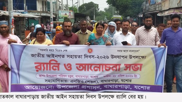 ’সরকারি খরচে বিরোধ শেষ, সবার আগে বাংলাদেশ’ এই প্রতিপাদ্য বিষয় নিয়ে গতকাল বাঘারপাড়ায় জাতীয় আইন সহায়তা দিবস ২০২৬ উদযাপন হয়েছে। বাঘারপাড়া উপজেলা প্রশাসন এ উপলক্ষে র্যালি ও আলোচনা সভার আয়োজন করে। র্যালি উপজেলা সদরের প্রধান সড়ক প্রদক্ষিণ শেষে পরিষদ মিলনায়তনে আলোচনা সভায় অংশ নেয় । এতে সভাপতিত্ব করেন উপজেলা নির্বাহী অফিসার ভুপালী সরকার। উপজেলা সমাজ সেবা কর্মকর্তা আশরাফুজ্জামানের সঞ্চালনায় এ সময় বক্তব্য রাখেন উপজেলা কৃষি কর্মকর্তা সায়েদা নাসরিন জাহান, প্রাথমিক শিক্ষা অফিসারমুশফিকুর রহমান, যুব উন্নয়ন কর্মকর্তা রেজাউল করিম তরফদার, পুলিশের সহকারি পরিদর্শক গোবিন্দ মন্ডল, বাঘারপাড়া প্রেসক্লাবের সভাপতি ইকবাল কবিরসহ বিভিন্ন এনজিও প্রতিনিধি।