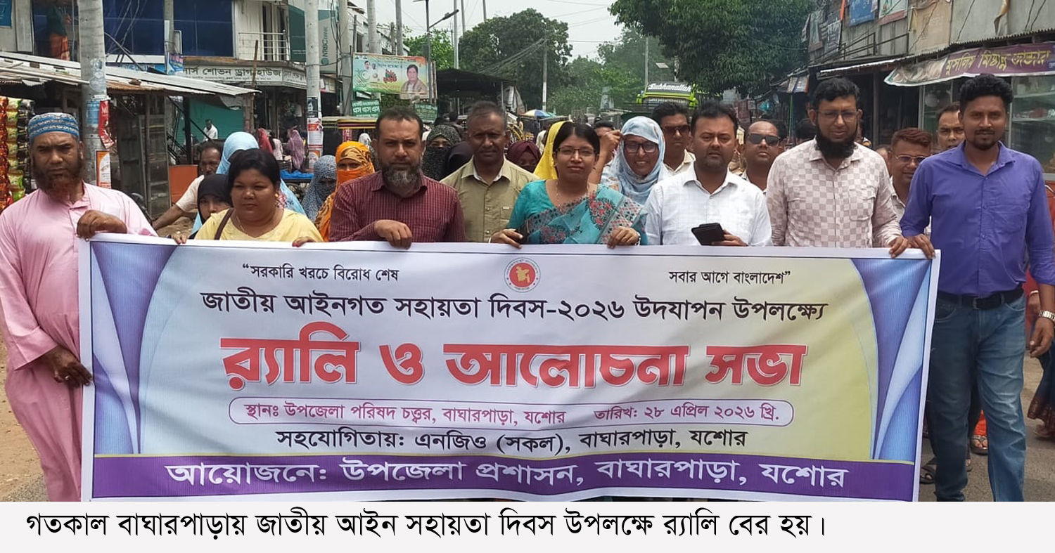 ’সরকারি খরচে বিরোধ শেষ, সবার আগে বাংলাদেশ’ এই প্রতিপাদ্য বিষয় নিয়ে গতকাল বাঘারপাড়ায় জাতীয় আইন সহায়তা দিবস ২০২৬ উদযাপন হয়েছে। বাঘারপাড়া উপজেলা প্রশাসন এ উপলক্ষে র্যালি ও আলোচনা সভার আয়োজন করে। র্যালি উপজেলা সদরের প্রধান সড়ক প্রদক্ষিণ শেষে পরিষদ মিলনায়তনে আলোচনা সভায় অংশ নেয় । এতে সভাপতিত্ব করেন উপজেলা নির্বাহী অফিসার ভুপালী সরকার। উপজেলা সমাজ সেবা কর্মকর্তা আশরাফুজ্জামানের সঞ্চালনায় এ সময় বক্তব্য রাখেন উপজেলা কৃষি কর্মকর্তা সায়েদা নাসরিন জাহান, প্রাথমিক শিক্ষা অফিসারমুশফিকুর রহমান, যুব উন্নয়ন কর্মকর্তা রেজাউল করিম তরফদার, পুলিশের সহকারি পরিদর্শক গোবিন্দ মন্ডল, বাঘারপাড়া প্রেসক্লাবের সভাপতি ইকবাল কবিরসহ বিভিন্ন এনজিও প্রতিনিধি।